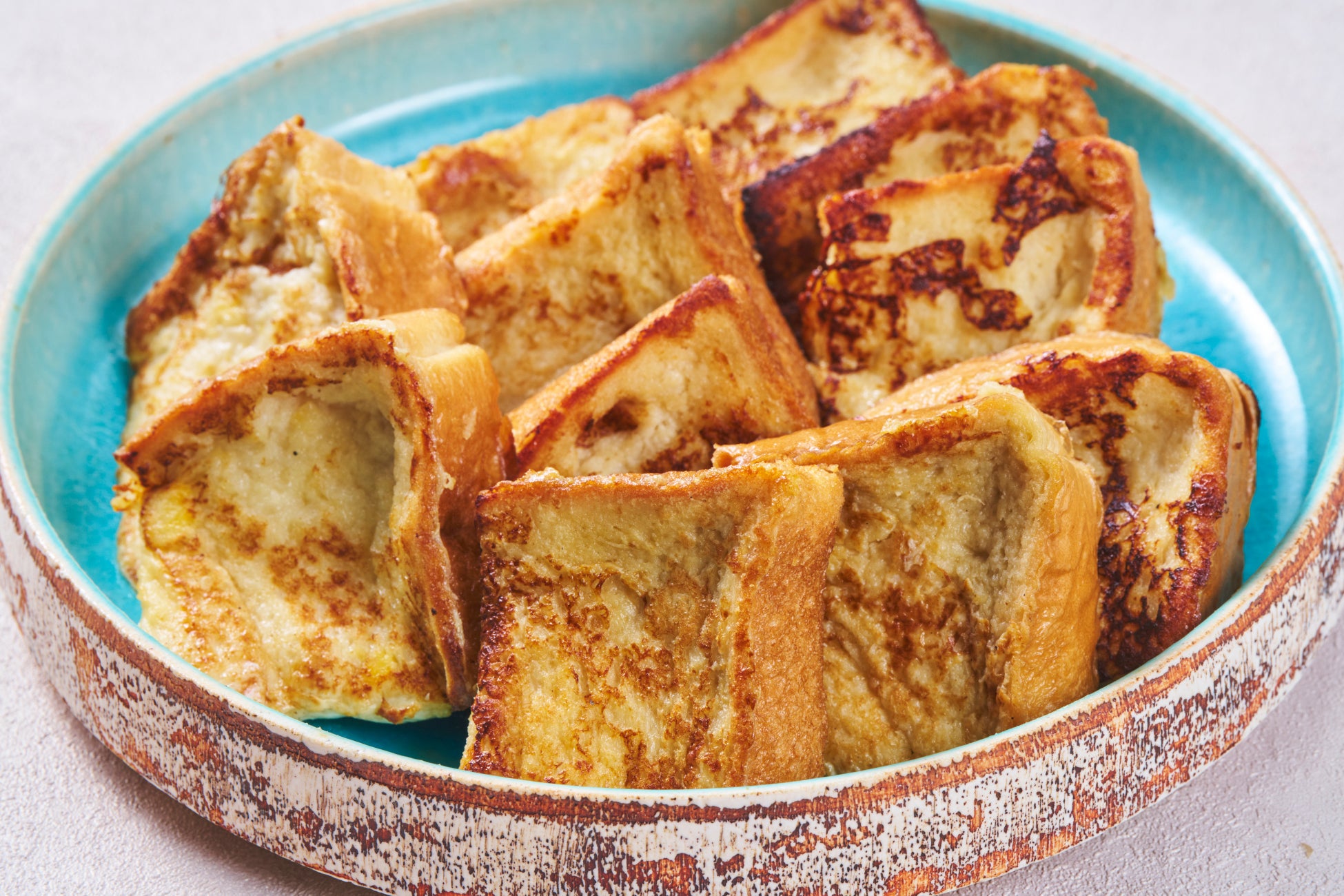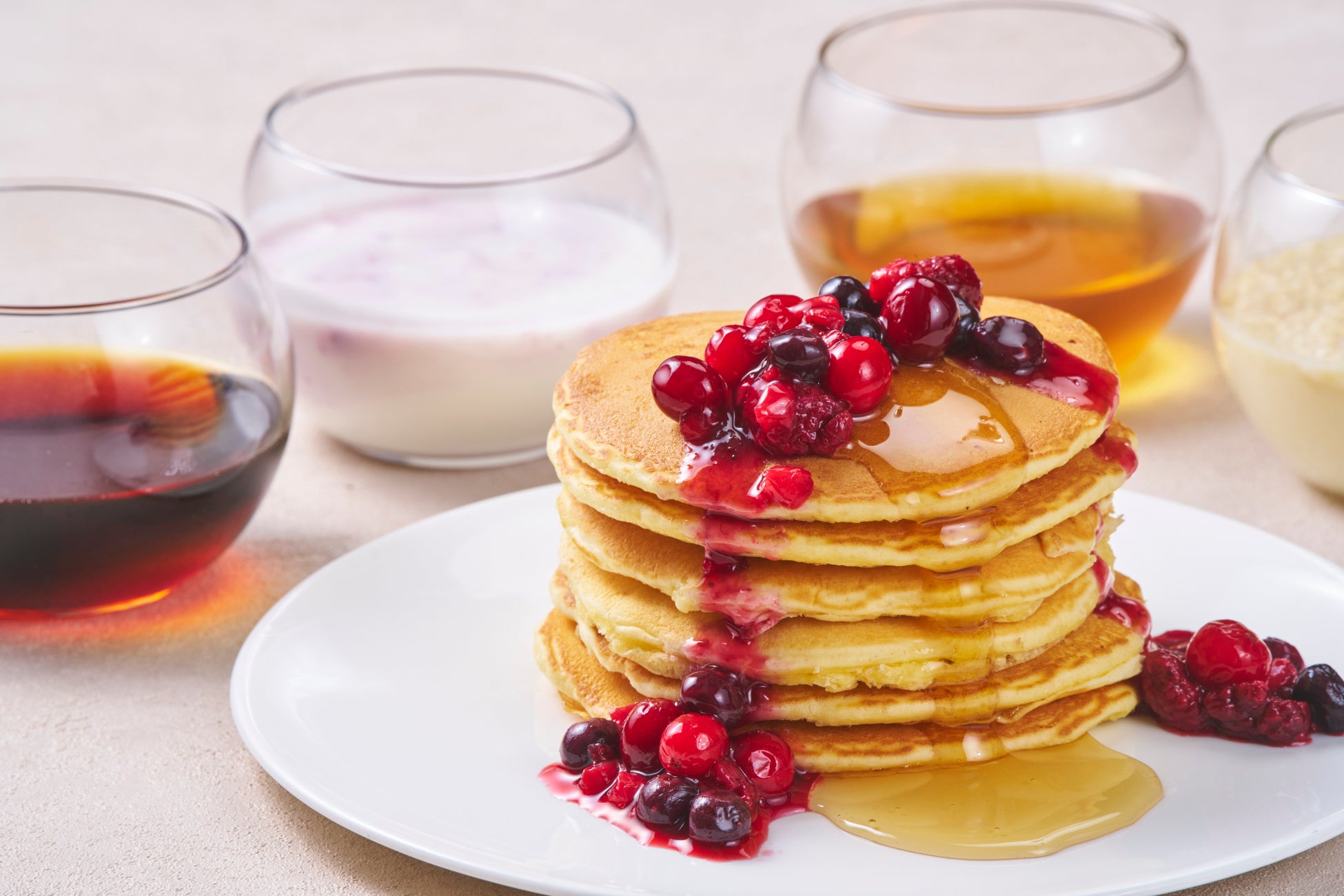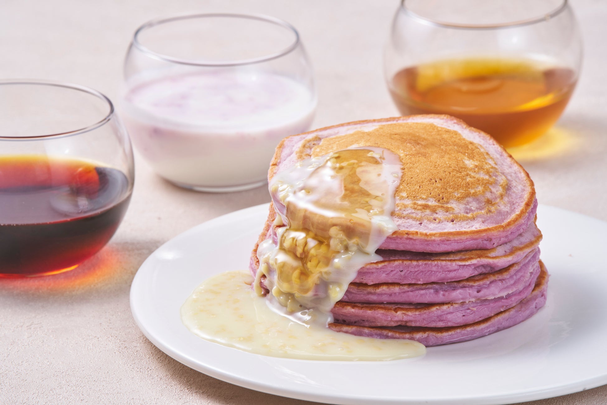 米粉を使用することでモチモチ食感に仕上げた紅芋パンケーキ。