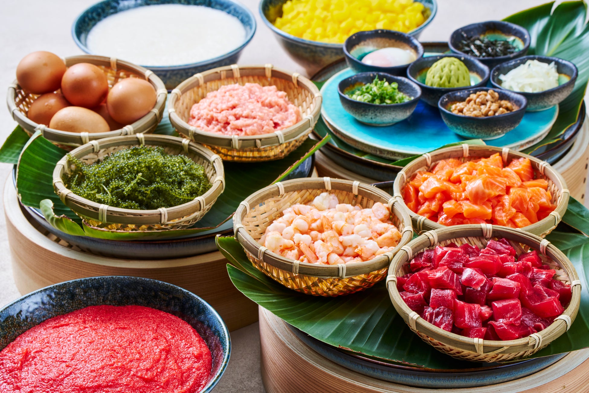 マグロ、サーモン、エビ、海ぶどうなどの新鮮な海の幸に加え、たくあん、パパイヤの甘酢漬けや明太子など多彩なトッピングを豊富にご用意。さらに、みやぎ農園の平飼い卵を使用した温泉卵が、まろやかな味わいを添えます。お好みの組み合わせで、自分だけのオリジナル海鮮丼をお楽しみください。