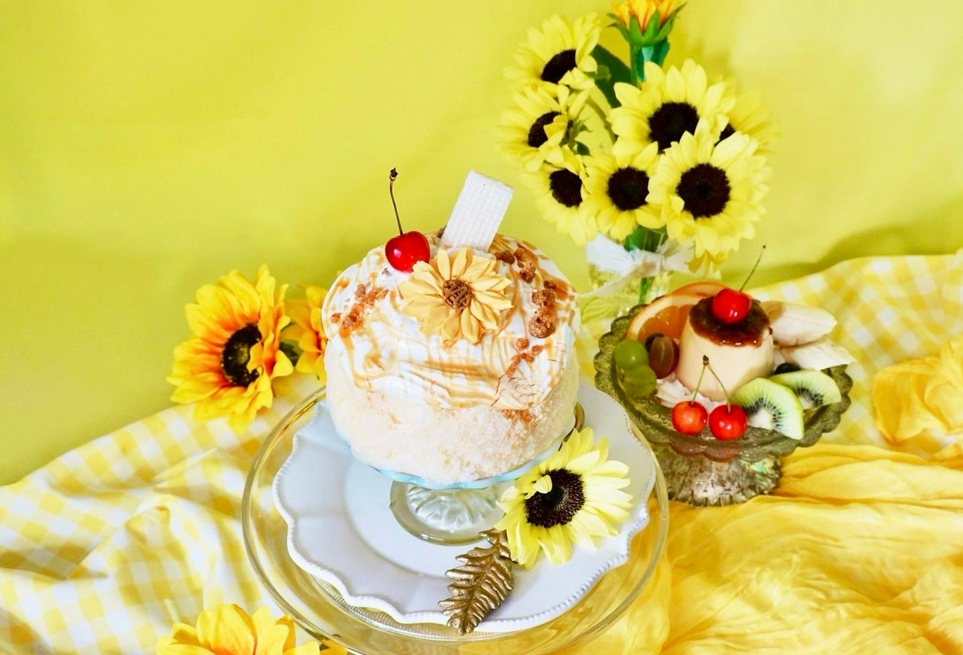 白あんのひまわりが咲く夏のかき氷。とろりカスタードソース、ふわふわシャンティエスプーマに、旬の果実とサクサクウエハース。キャラメリゼアーモンドと追いカラメルで華やかな甘さを。