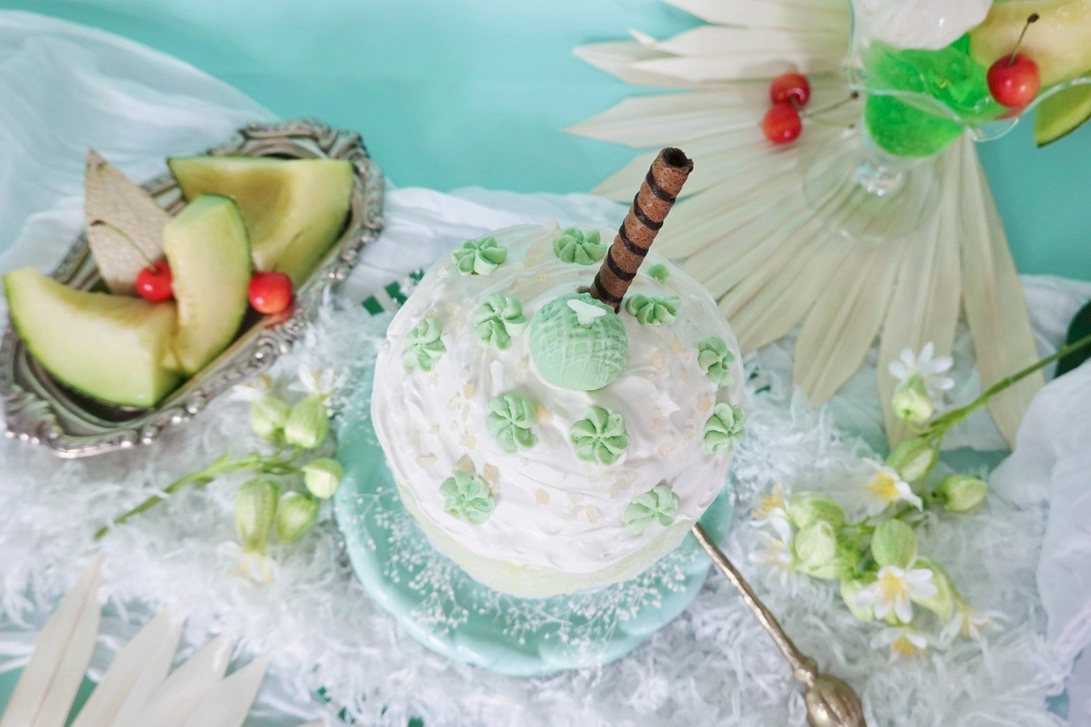 ふわふわ氷に生メロンソース、シャンティエスプーマ、白あん花をトッピング。パチパチキャンディとストロークッキーで遊び心満載。
