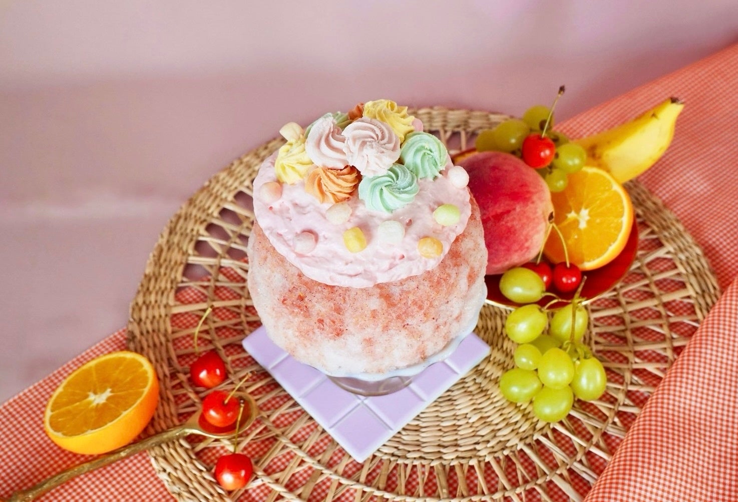 ヨーグルトエスプーマと白あんローズが彩るカラフルなかき氷。ミックスジュース風ソースとサクサククッキーで、甘みと酸味の新感覚スムージーを。