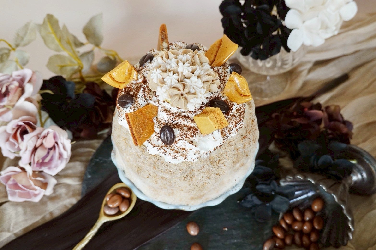 ダルゴナコーヒーを絶品かき氷に。コーヒー香るエスプーマと白あんクリームの花、カリカリダルゴナとマカロンがアクセント。ほろ苦い自家製コーヒーシロップで、甘さと苦さの絶妙な一杯を。