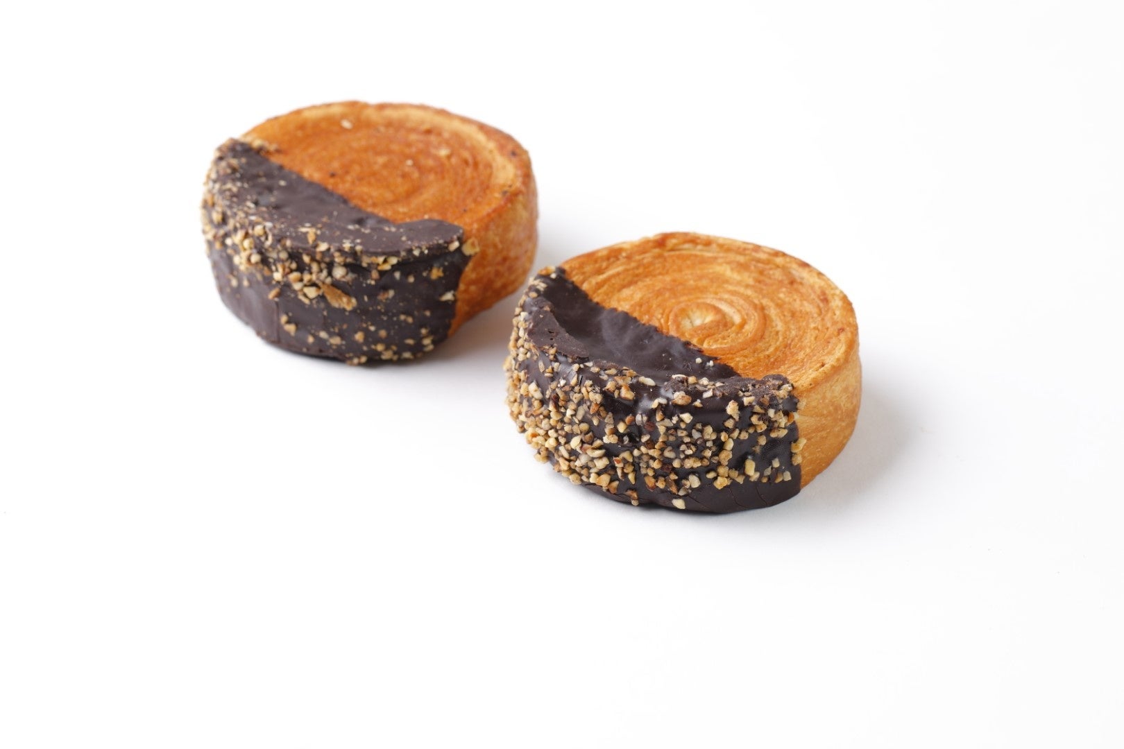 クロワッサン生地にチョコレートペーストをフィリングし、チョコレートとヘーゼルナッツをトッピングしました。