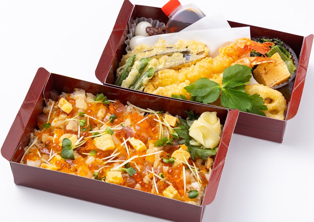 まぐろ赤身、いくら、数の子などを贅沢にのせた切り込みばら寿司と、大ぶりの海老天2本を含む天ぷら盛り合わせを詰め込んだ、見た目も華やかな一折。柿家すしのこだわりが詰まった贅沢なお寿司弁当です。