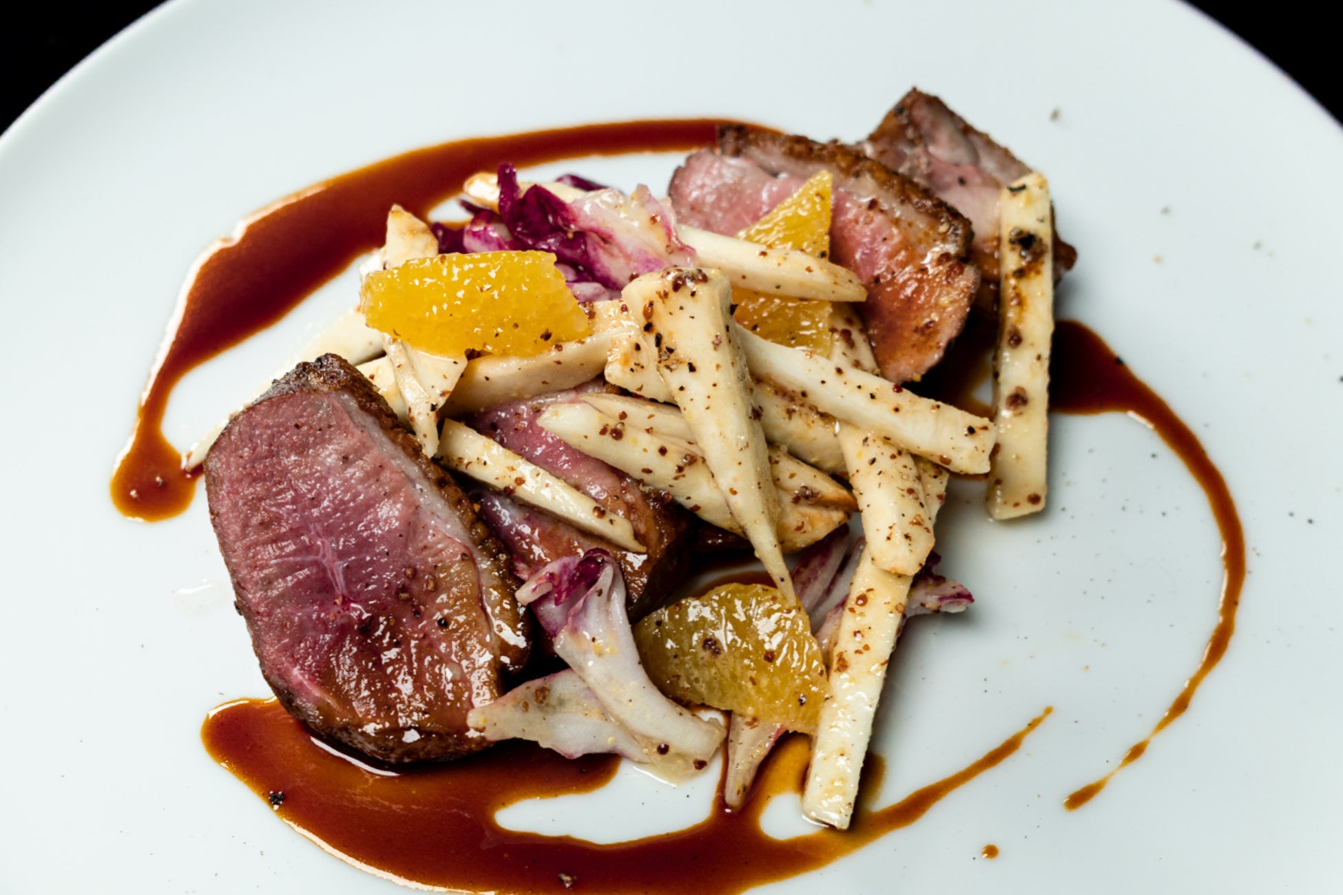 鴨と牛の出汁をベースに、ブラッドオレンジの香りを重ねたソースが、肉の滋味を一層引き立てます。