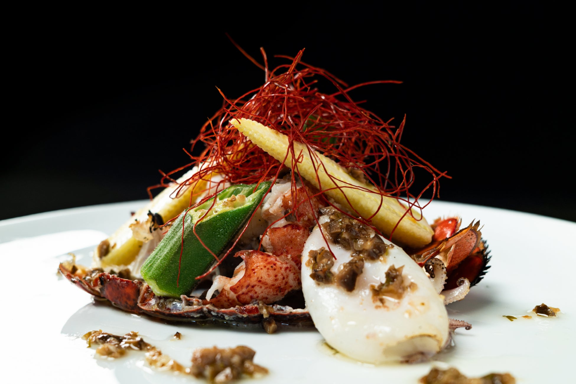 肉厚で甘味のあるオマール海老と、プリッとした歯応えが魅力のヤリイカをグリルし、黒オリーブとレモンを効かせたソースでさっぱりと仕上げました。