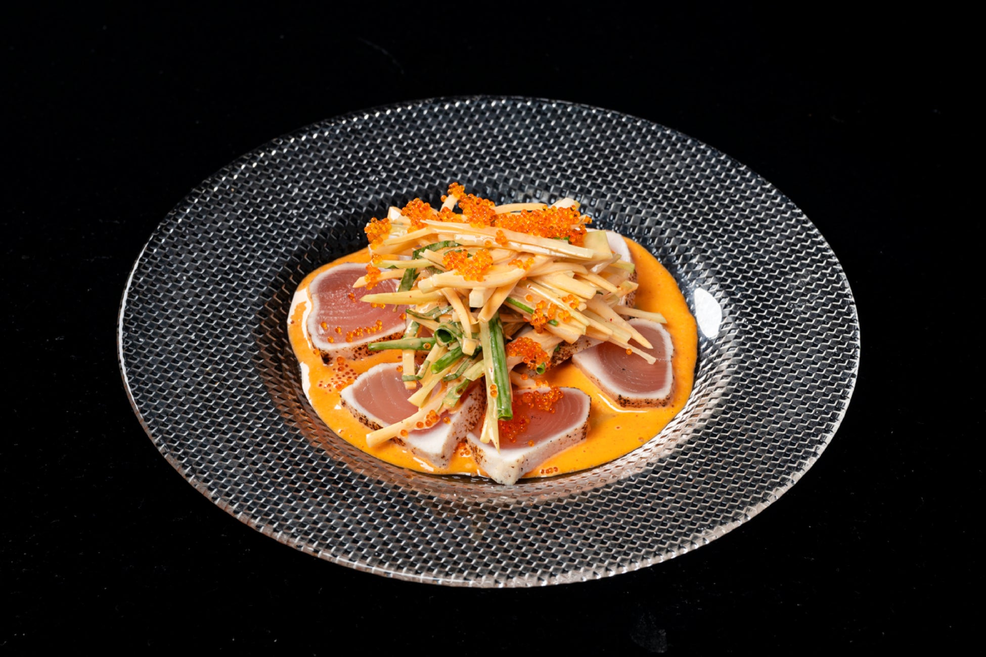 軽く炙って、旨みを閉じ込めた備長マグロに唐辛子と酢、にんにくを効かせたタイ発祥のチリソース『シラチャー』とアイオリを合わせ、まろやかな辛味とコクを添えました。