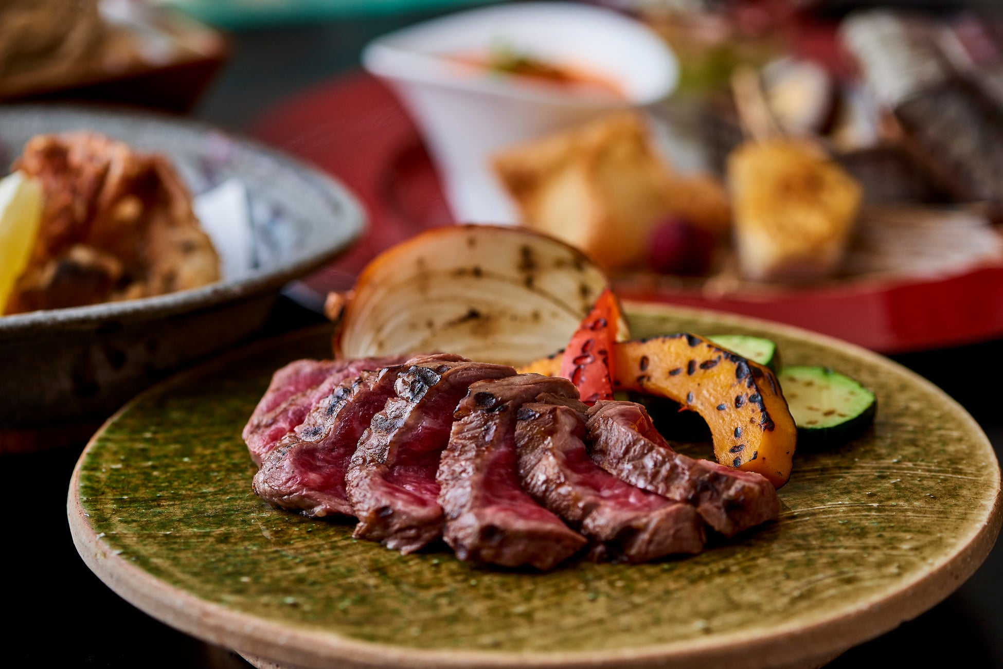 料理ライブならではの迫力を楽しめるカウンター席と、広々と開放感のあるダイニングスペースでは、炙り・炭火&鉄板焼き料理をご用意いたします。ペアプランでは、日本のさまざまな産地から厳選した牛肉を炭火でじっくりと焼き上げ、炭火独特の香りをまとった贅沢な逸品をご賞味いただけます。