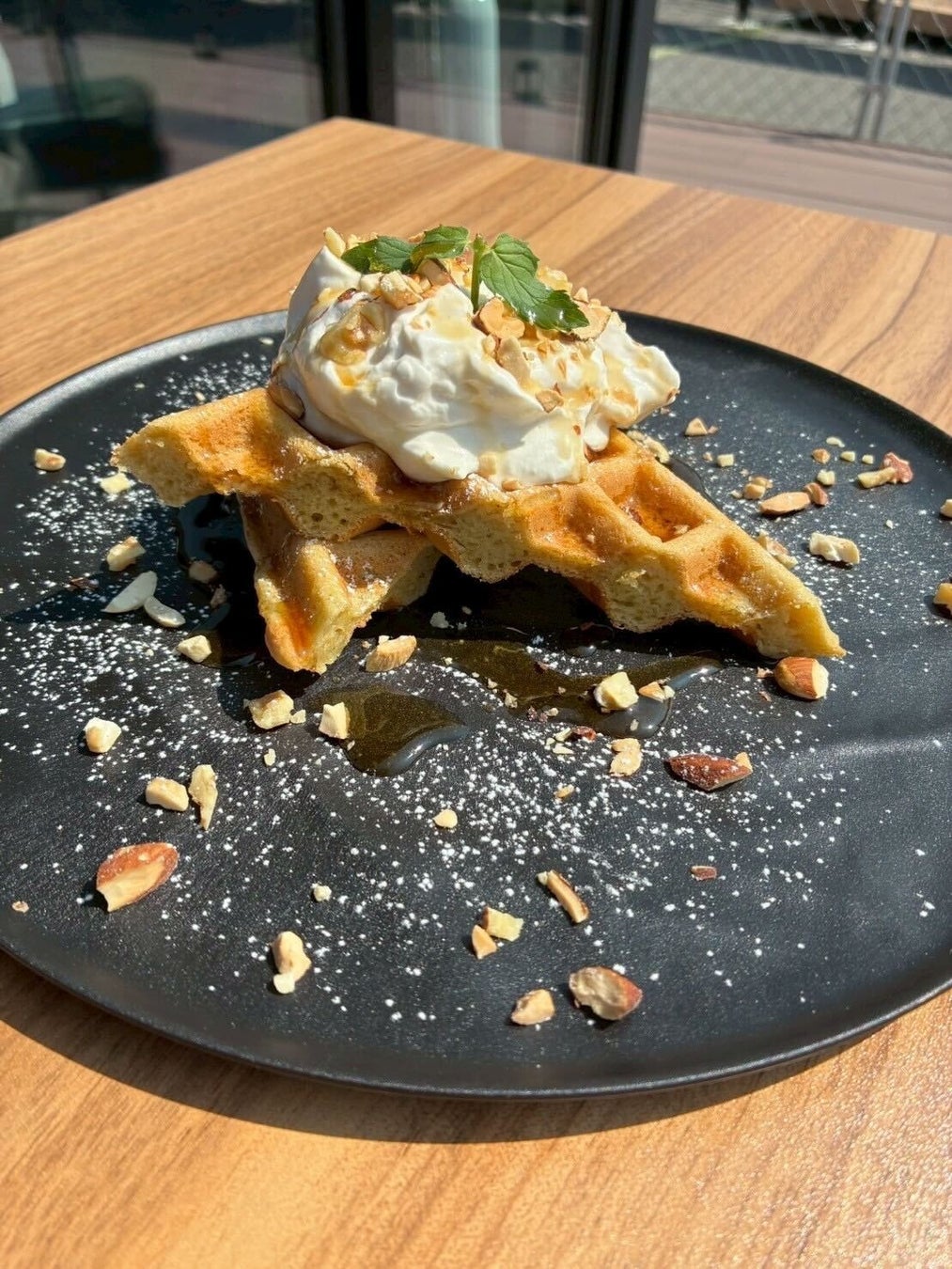 玄米粉100%で焼き上げたワッフルは、外はカリッと香ばしく、中はもっちり。グルテンフリーとは思えない満足感のある食感です。