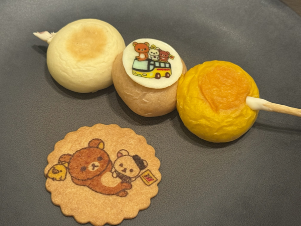 昼食では、ツアー限定のオリジナルデザート付(リラックマの大好物のお団子を菓子パンで再現!)