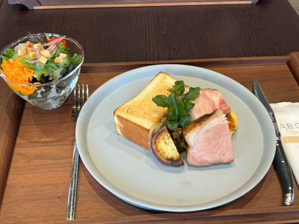 朝食で最も人気なのは「モーニングプレート・コンプレ」。県内の契約農家から直送された旬の野菜や具材をオープンサンドで手軽に、かつ贅沢に味わえます。