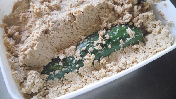 - 清潔な袋にきゅうり、ぬか(大さじ2)、塩(少々)を入れる