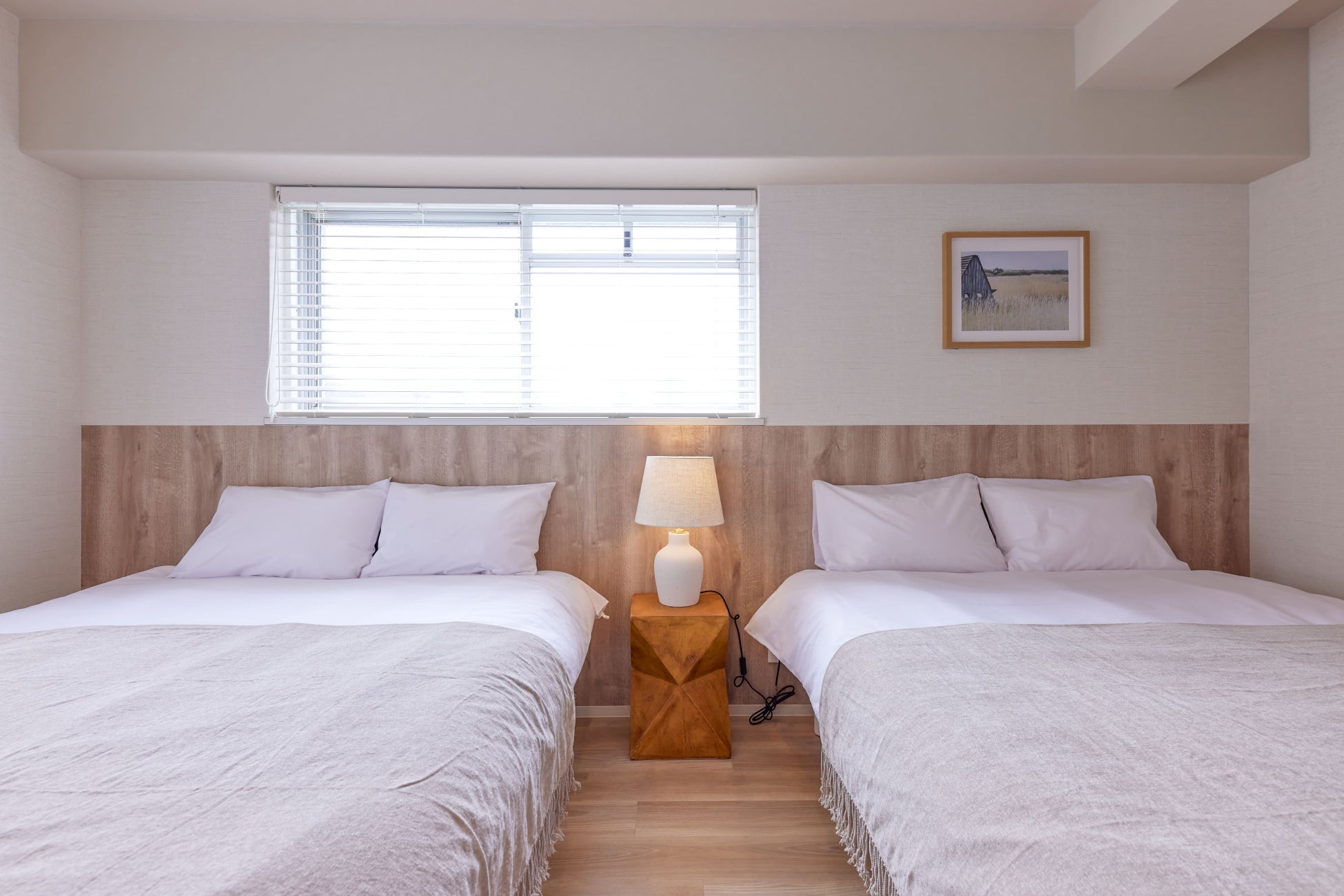 寝室は合計で4部屋あり、最大12名まで宿泊が可能です。洋室だけでなく和室も用意しているので、小さいお子様やベッドが苦手な方も安心です。(洋室1:ダブルベッド1台/洋室2:シングルベッド2台/洋室3:ダブルベッド2台/和室:布団2組/リビング:ダブルサイズソファベッド1台)