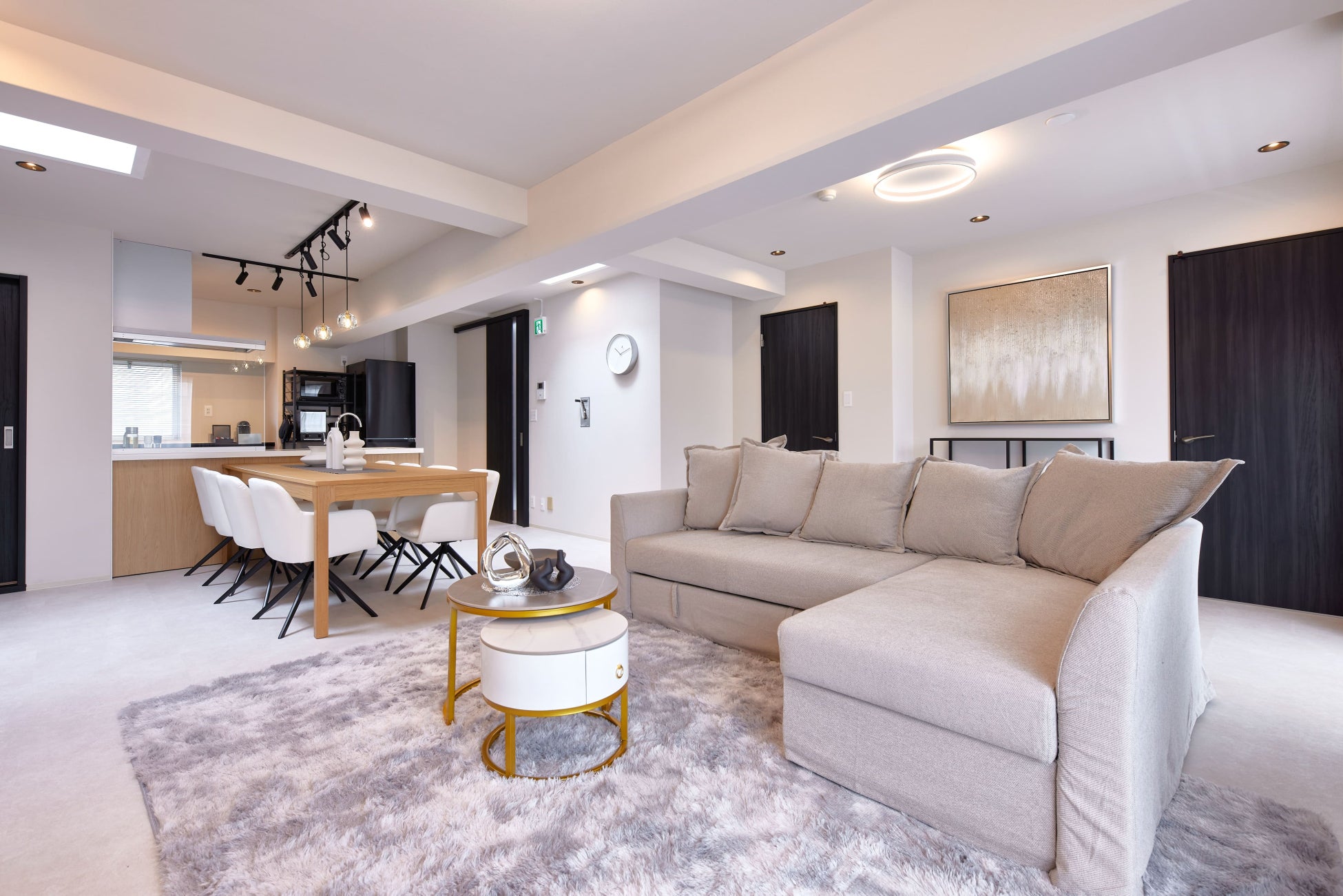 床面は白い大理石調の素材を使用する事で空間に高級感と清潔感をプラス。黒をアクセントとしたモダンでエッジのある家具や内装が引き立ちます。