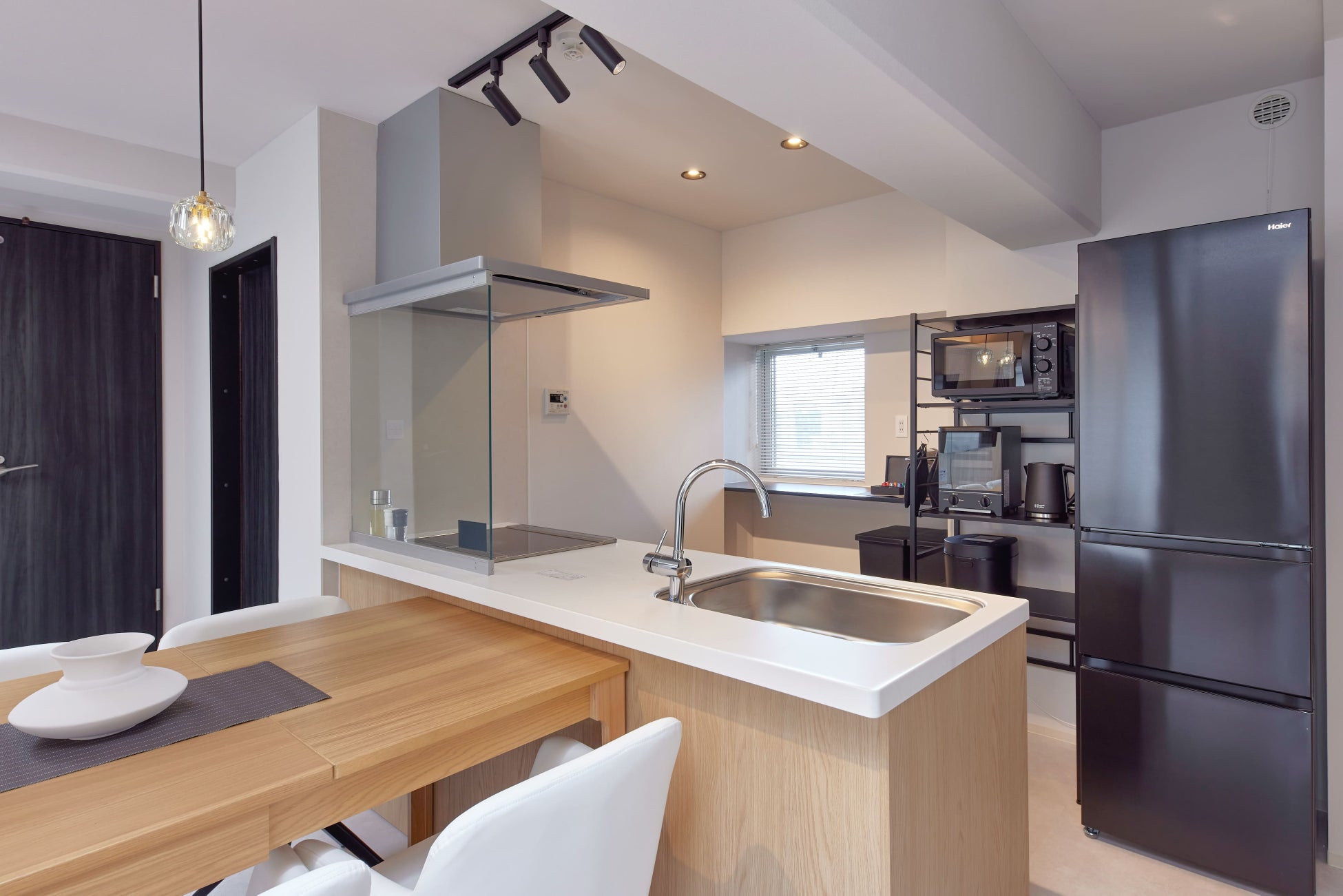 キッチンには充実したカトラリーのほか、ポットや電子レンジなどの従来の民泊の設備にくわえ土鍋や炊飯器 無料のコーヒーメーカーも用意。