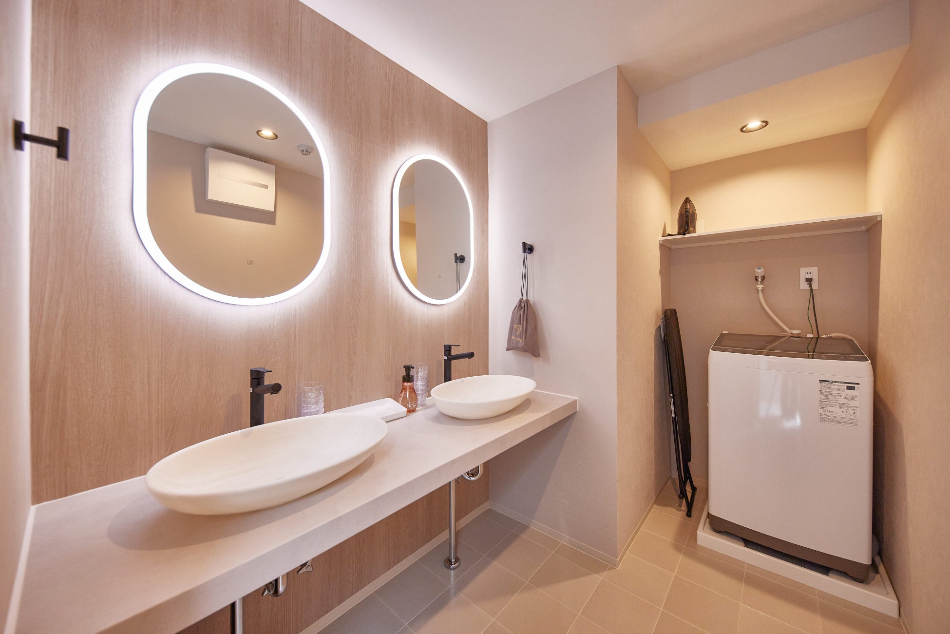 洗面化粧室はダブルボウル仕様に。大人数での宿泊に対応できるよう、ミラー、ドライヤーもそれぞれ2つずつ設置しました。照明付きミラーは化粧のしやすさだけではなく洗面室全体の雰囲気を整えてくれます。また、洗濯機やアイロンも備えているので長期滞在でも安心です。