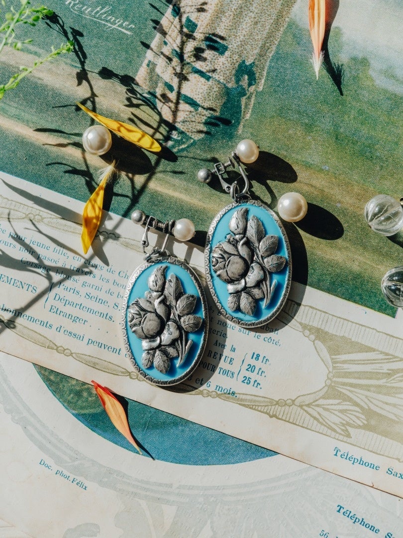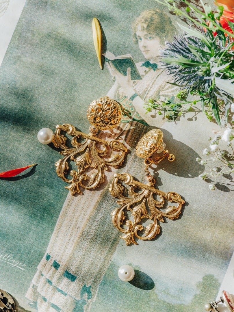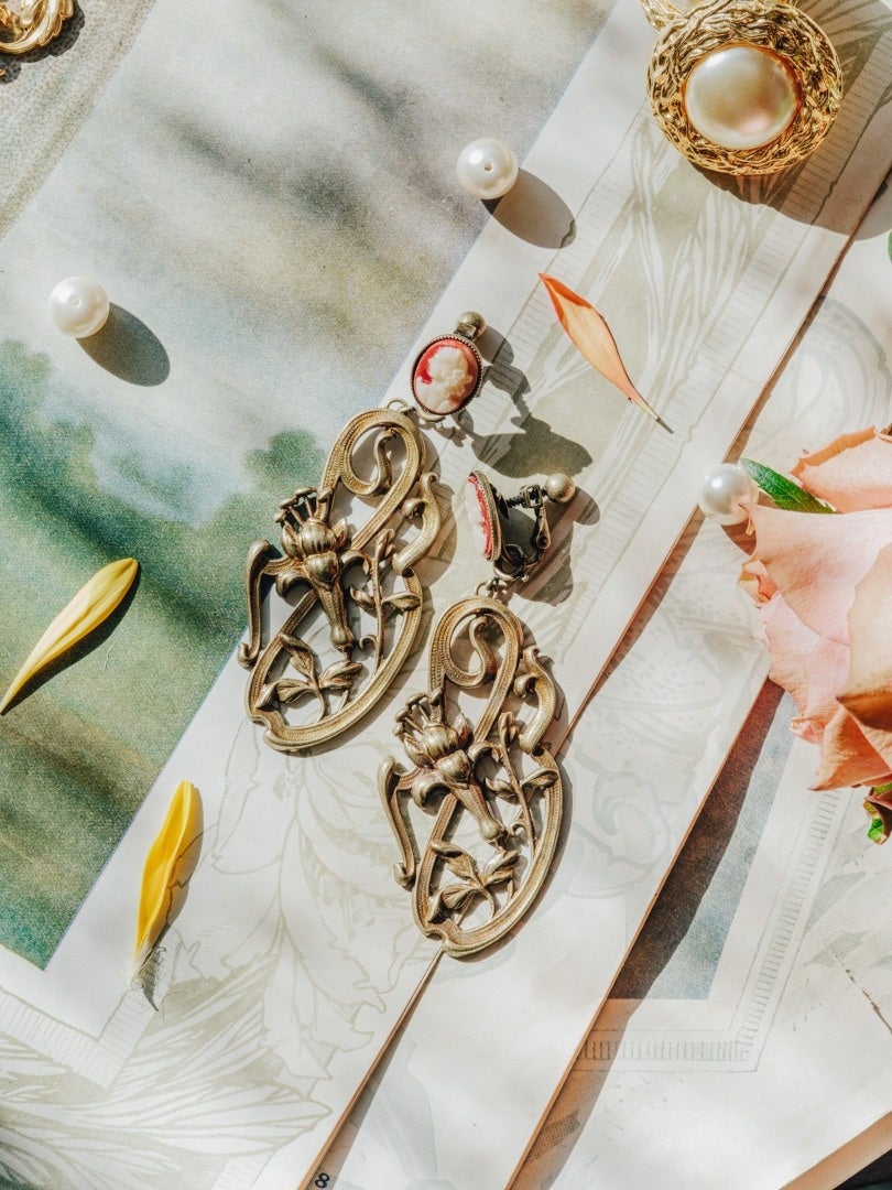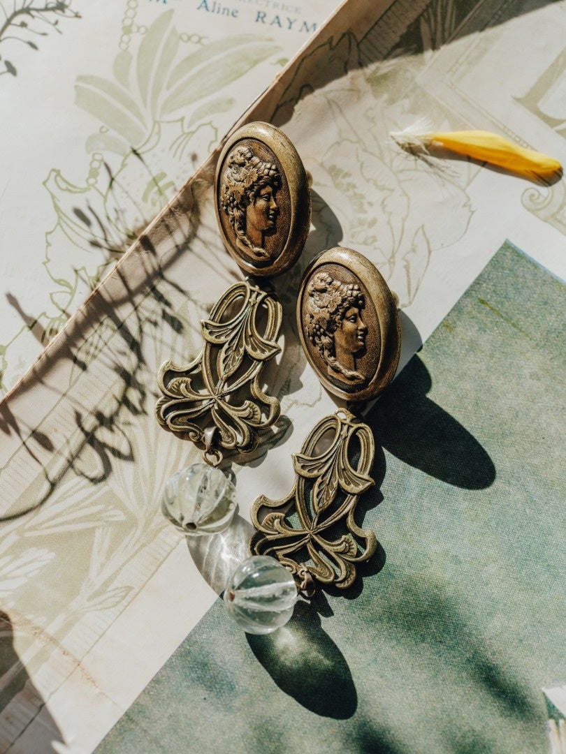フランスのアンティークモチーフを日本で職人さんにジュエリーパーツとして使えるように加工していただき、パリのヴィンテージカメオと合わせたお品。2way仕様でトップ部分のカメオイヤリング/ピアスとしてもご使用いただけます。