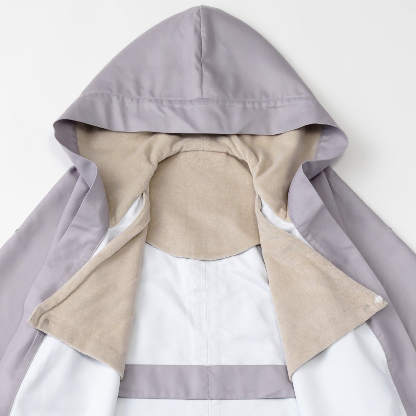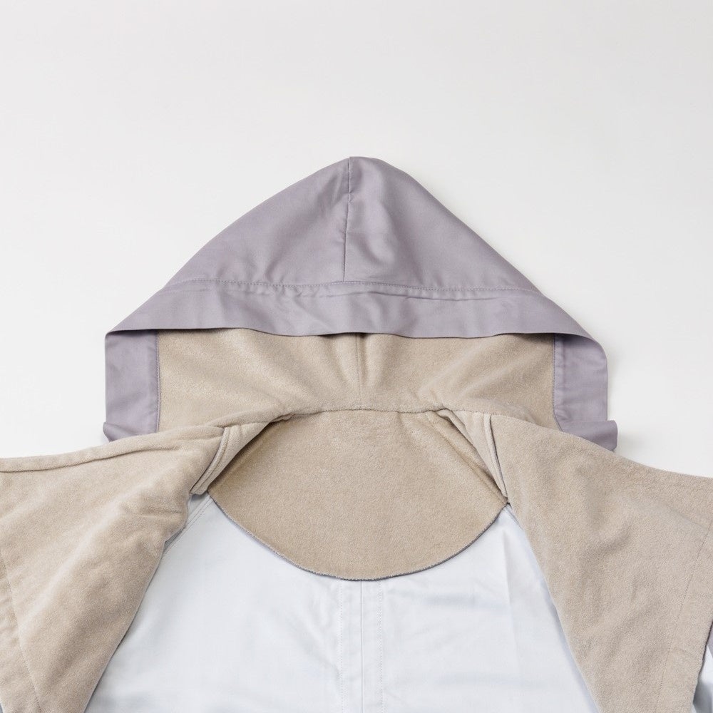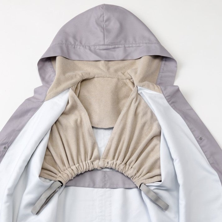 背中上部とフードにはパイル地の生地を重ね、髪の毛の水分もしっかりとキャッチできるように。