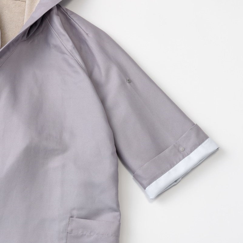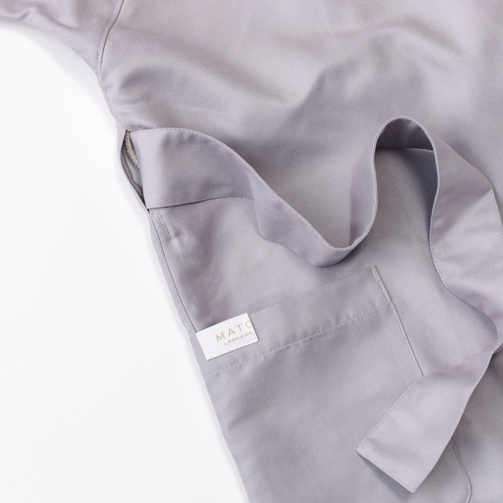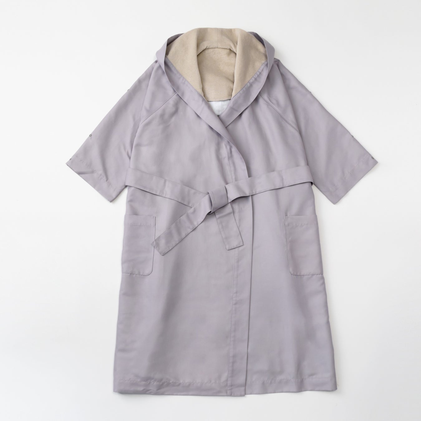 袖には折り上げ用の2段階スナップボタンを配置し、お風呂上りにそのまま家事や作業ができるデザインに。ウエストベルトは本体に縫い付けられており、洗濯時に紛失する心配もなく、着脱時にはフックにかけられるようループもあしらいました。