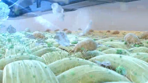 [ 検査方法 ] 生きたダニ(1,000匹)を織布(100㎝²)に散布して約0.54秒(約37cm/s)の速度で製品を1往復させて、ダニ残数を測定 ※全てのダニに有用ではありません。