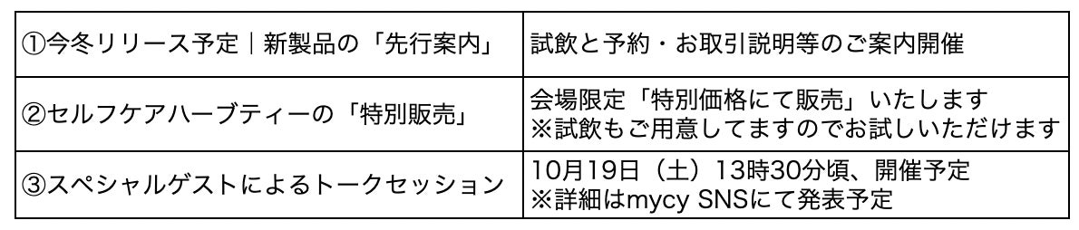 この展示会では、mycyの【新製品を初披露と試飲】が体験できるブース、【会場限定価格】セルフケアハーブティーの試飲や販売を行います。