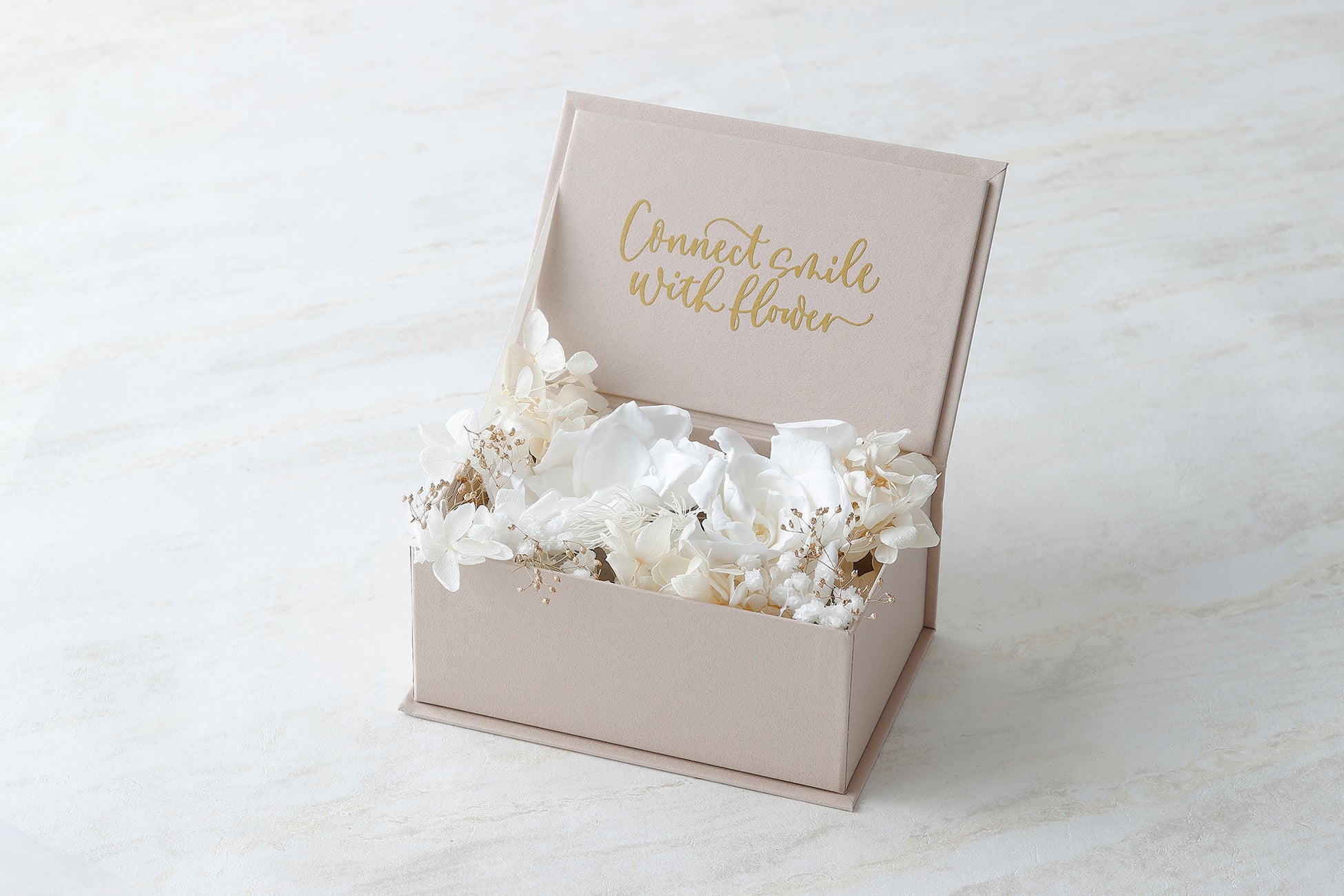 リングピローは、『洗練』や『優雅』、喜びを運ぶという祝福を意味する花言葉を持つといわれる、真っ白なクチナシのプリザーブドフラワーをメインに、シンプルなボックスにメッセージを添えた洗練されたデザインに。新郎新婦様の特別な想いを込めながら、美しいリングピロー作りを皆様にお楽しみいただけます。結婚式を彩る特別なペアリングを置くリングピローをハンドメイドで作り、これからのおふたりの祝福や喜びのシンボルとして、挙式後はウェルカムスペースやご自宅のインテリアとしても末永くお使いいただけます。