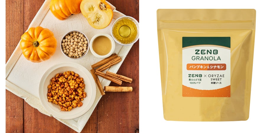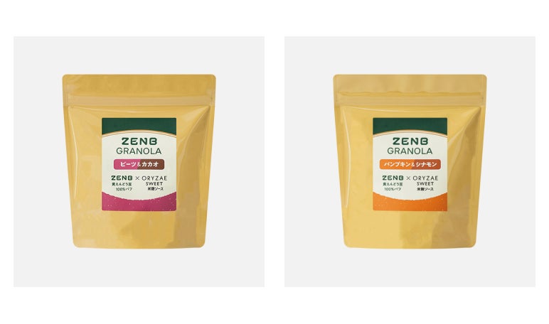 日本の伝統発酵技術を用いて社会課題解決を目指す株式会社オリゼ(所在地:東京都目黒区、代表取締役:小泉泰英、以下「ORYZAE」)は、植物を可能な限りまるごとつかった食で、ウェルビーイングな食生活を提案する株式会社ZENB JAPAN(ゼンブ ジャパン)(所在地:愛知県半田市、代表取締役:濱名 誠久、以下「ZENB」)とコラボレーションを実施します。ZENBが、ORYZAEの米麹ソースを使い、スーパーフード黄えんどう豆100%でできたパフに、普段捨ててしまう皮や種・わたまでまるごとの野菜などを加えて焼き上げた、やさしい甘さでザクザク食感の「ZENBグラノーラ」を2024年10月16日(水)よりZENBサイト(https://zenb.jp)にて新発売します。「ビーツ&カカオ」、「パンプキン&シナモン」の2フレーバーを合計3,000袋の数量限定で販売します。