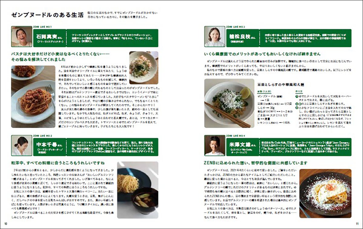 本書には、「ZENBヌードル」をおいしく食べる茹で方や、プロ監修のスペシャルメニュー、豆の旨みや栄養が溶けだしたゆで汁まで余すことなく活用したレシピまで、毎日の食卓に彩りを添えてくれる様々なコンテンツを掲載しています。「ZENBヌードル」の愛食者である石岡真実さん(フリーランスディレクター)、植松良枝さん(料理研究家)、中本千尋さん(フードコーディネーター/料理家)、米澤文雄さん(レストラン「No Code」オーナーシェフ)のコメントや食べ方のコツも必読です。