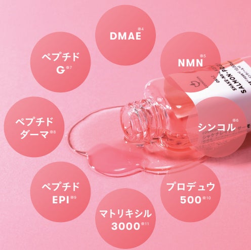 ※1 DNA-Na(整肌成分)※2 弾力がありキメが整って、みずみずしく光をはなつ肌のこと ※3自社製品比において ※4 酒石酸ジメチルアミノエタノール(整肌成分) ※5 ニコチンアミドモノヌクレオチド(整肌成分) ※6 パルミトイルトリペプチド‐5、グリセリン、水(整肌成分) ※7 オリゴペプチド‐20、水、BG(整肌成分) ※8 アセチルデカペプチド‐3、水、BG(整肌成分) ※9 オリゴペプチド‐24、水、BG(整肌成分) ※10 PCA-Na、乳酸Na、アルギニン、アスパラギン酸、PCA、グリシン、アラニン、セリン、バリン、プロリン、トレオニン、イソロイシン、ヒスチジン、フェニルアラニン(整肌成分) ※11 パルミトイルテトラペプチド-1、パルミトイルトリペプチド-7、ポリソルベート20、カルボマー、グリセリン、水、BG(整肌成分) ※12 パンテノール(整肌成分)※13 アスコルビン酸(整肌成分)