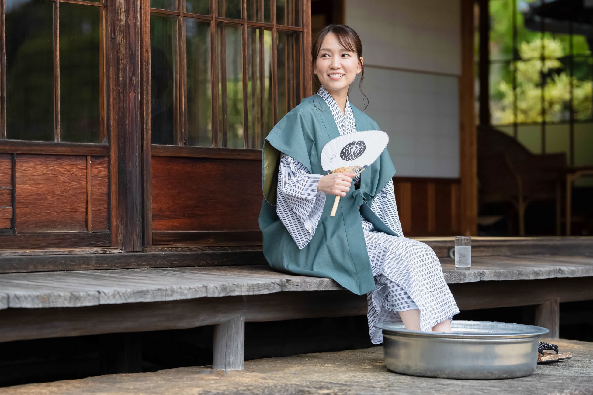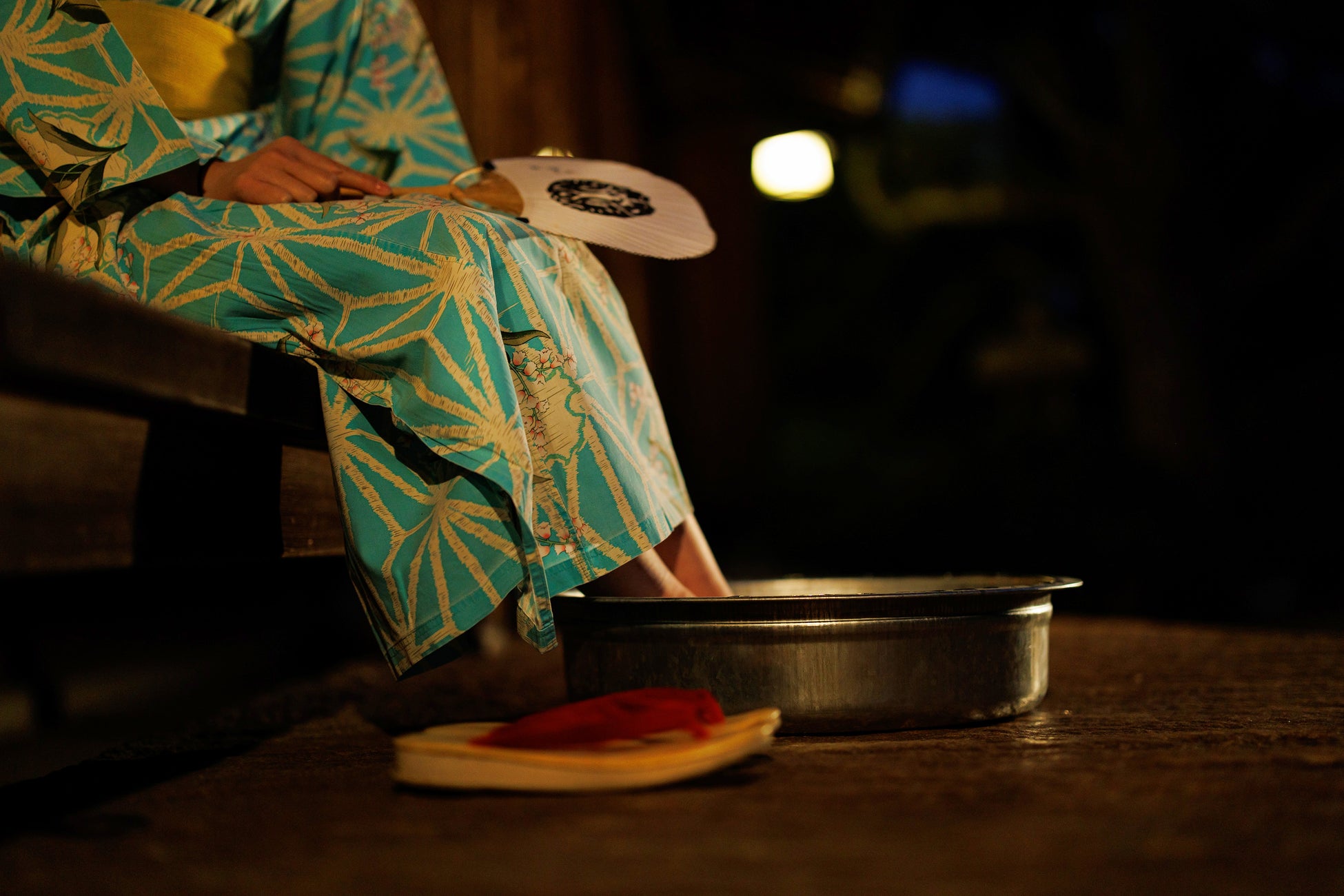 広縁に腰掛け、たらいに足を浸してほっとひと息。