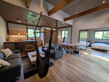 コテージ内にはテーブルにソファ、そしてハンモック!これはテンションがあがります。キッチンに調理器具はありませんが、食器は揃っていました。