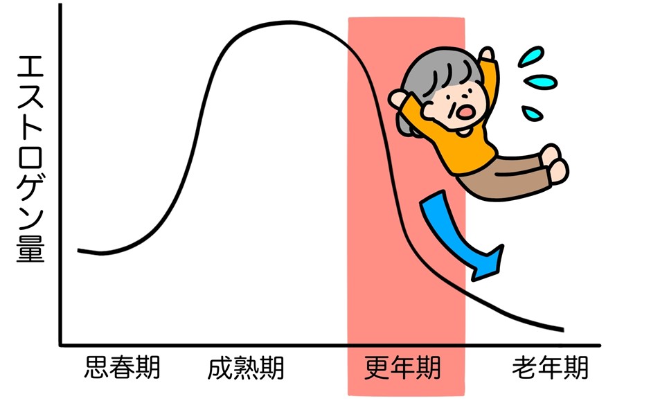 プレ更年期では、このエストロゲンが少しずつ減り始め、生理不順、皮膚の乾燥、抜け毛、関節のこわばりなどの症状があらわれ始めます。