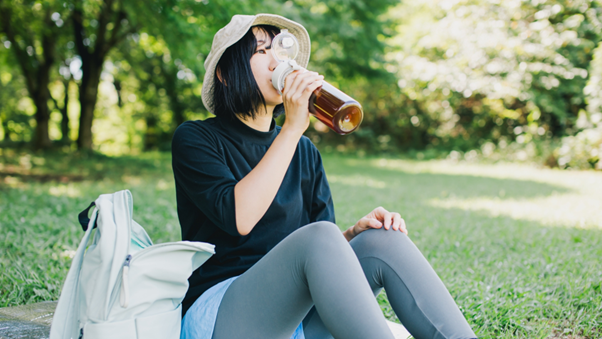 利尿作用のあるカフェインを含むコーヒーや緑茶だけではなく、常温の水や麦茶を携帯しましょう。