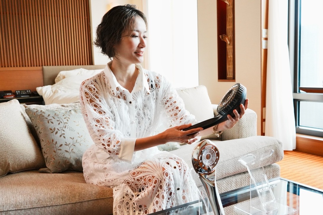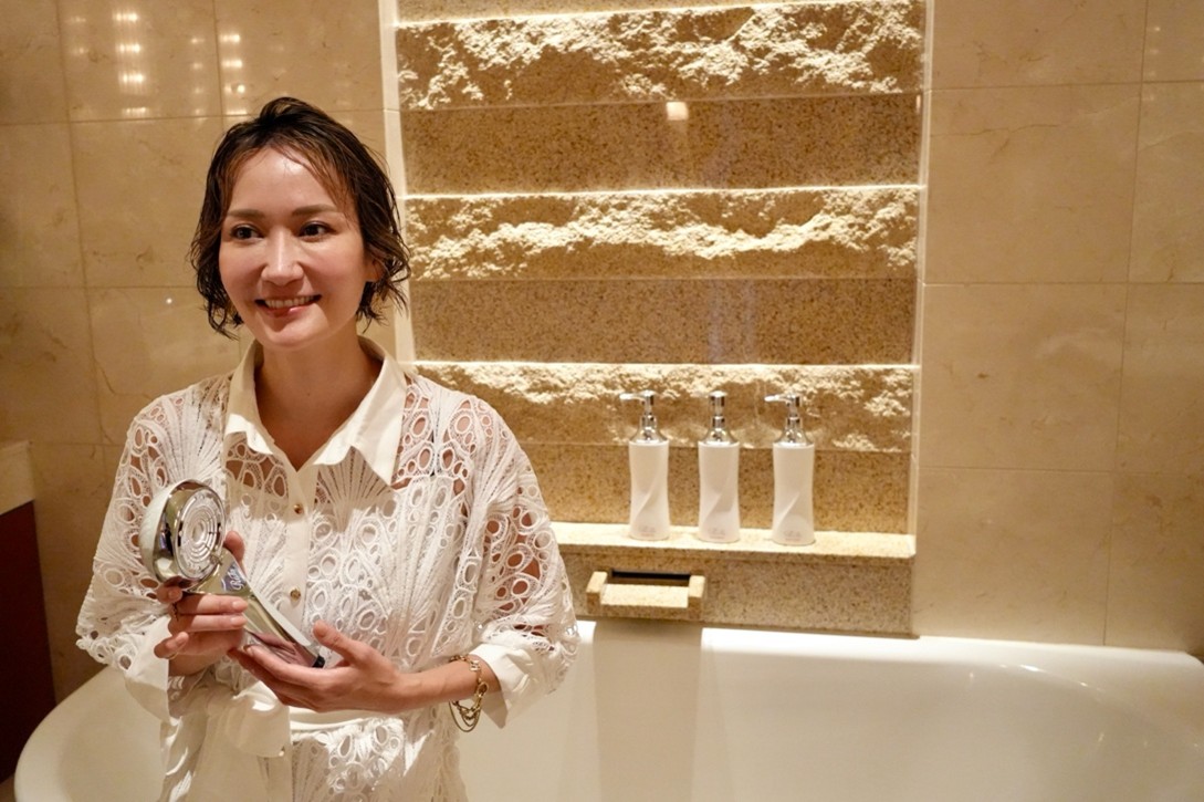 笹野さんがまず試したのはシャワーヘッドでした。「ReFa FINE BUBBLE DIA 150」と「ReFa FINE BUBBLE U」は、どちらも肌にやさしい印象があり、普段から知っている製品でもホテルで改めて使うと特別感があります。