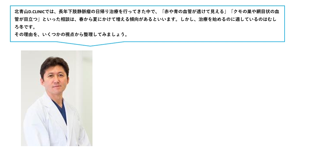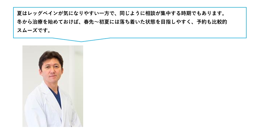 そして、紫外線が弱く、脚を出す機会が少なく、さらに予約も取りやすい冬は、治療を進めるのにとても適した静かなお得シーズン。春夏の脚を出す季節を気持ちよく迎えるためにも、「気になった今」こそ専門医へ相談を始めるベストタイミングと言えるでしょう。
