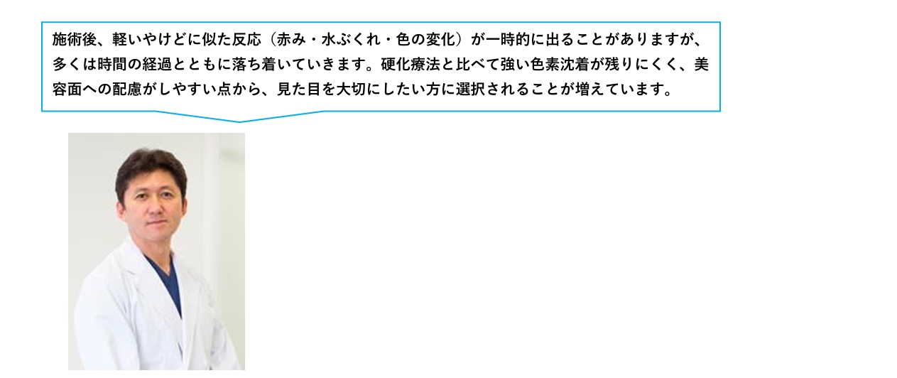かつては、血管の中に硬化剤を注射して壁同士をくっつける「硬化療法」が主でしたが、赤や紫など1mm未満の非常に細い血管には適さない場合があり、治療後に比較的強い色素沈着が1〜2年残ることもありました。