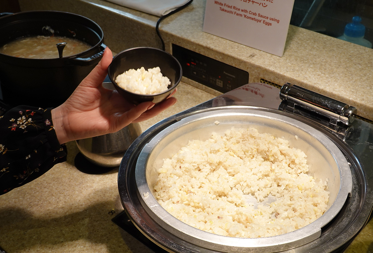 - 竹内養鶏場「米艶」を使った蟹餡かけ白チャーハン