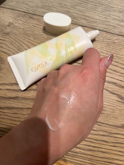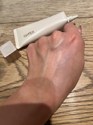 「結構色がついてるな」と思ったものの、肌に伸ばすとスーッと馴染んで白浮きはゼロ.みずみずしいテクスチャーで、乳液を塗っているような感覚です。