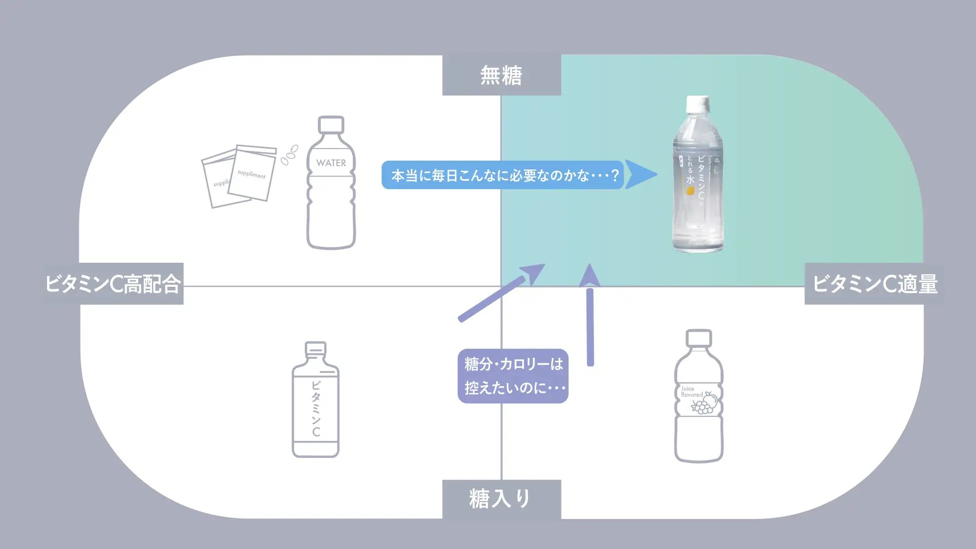 ビタミンCは「たくさんとるもの」というイメージが強いですが、実際には推奨量はそこまで多くありません。しかし、 忙しい日常の中でサプリメントを意識して飲み続けるのはハードルが高いですし、全ての人にとって多量のビタミンCが必要なわけでもありません。だからこそ私たちは、「水分補給」という無意識に近い行動の中で、とりすぎない、ちょうど良い量のビタミンCを無理なく補える形を目指しました。甘さでごまかさず、水として心地よく飲めること。そのうえで、飲み終わったあとに「今日もちゃんと自分をいたわれた」と感じてもらえれば1本になればうれしいです。