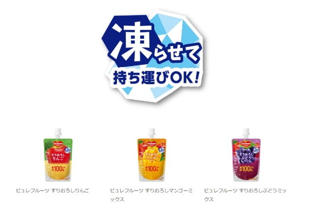 パッケージに配された「凍らせて持ち運びOK!」のロゴが示す通り、このパウチは冷凍保存が可能。お弁当の保冷剤代わりにバッグへ忍ばせておけば、ランチタイムには絶妙なシャリシャリ感のフローズン・デザートに。