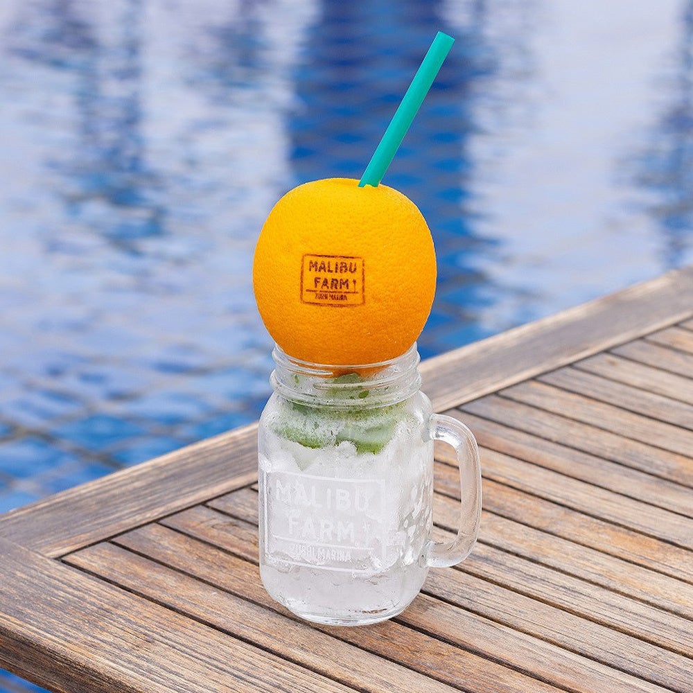 ターやソーダで割っても爽やかに。マリブファームのロゴがキュートなドリンク。