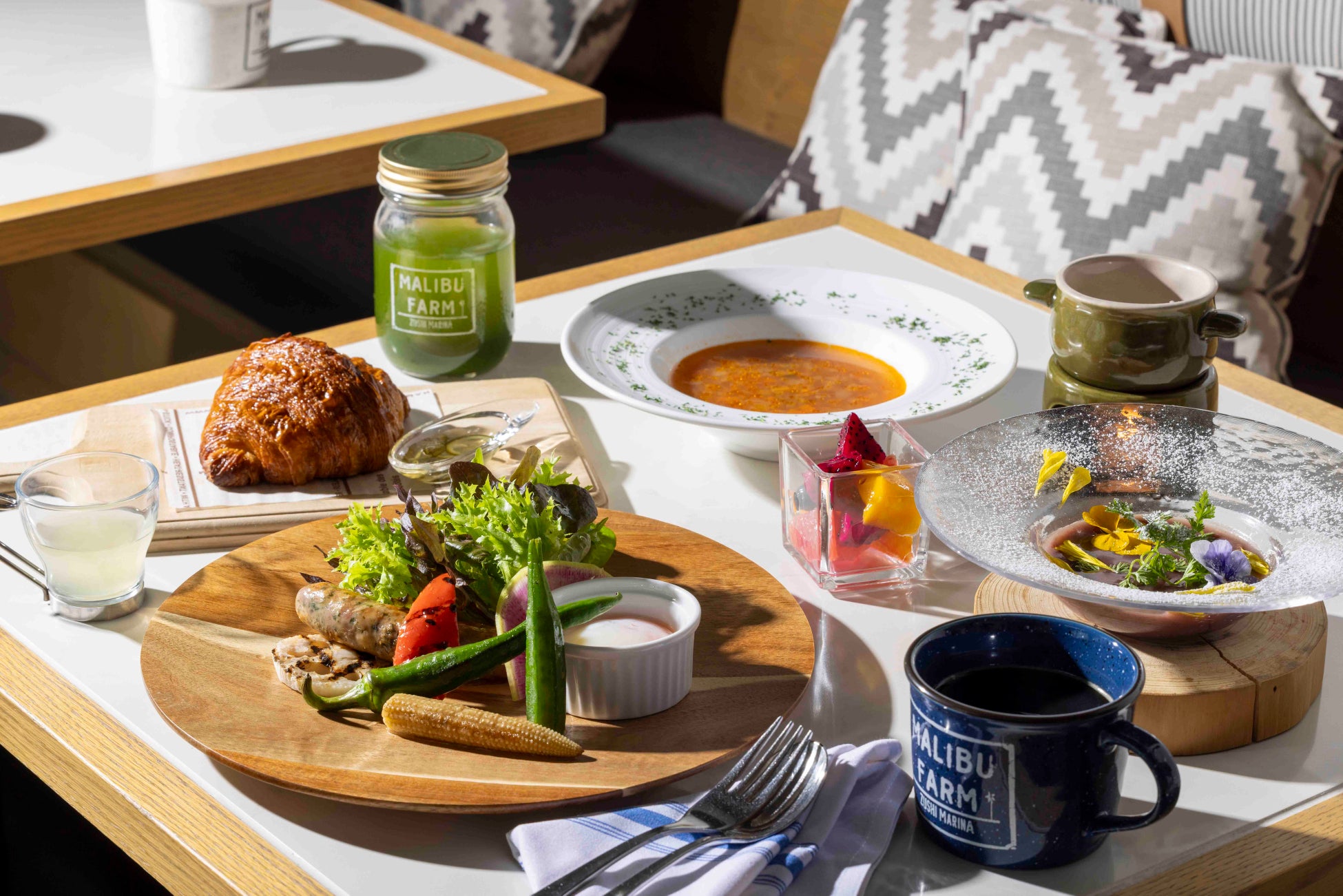 マリブファームでは「サンライズ・ウェルネス」をテーマに、地元湘南で循環する野菜(*1)や地産食材を用いた朝食を提供し、ウェルビーイングとサステナブルな観光ニーズに応えます。 提供する朝食メニューは、マリブホテル宿泊者朝食メニューの一つである「FRESH GREEN MORNING」(完全予約制)、新登場の「モーニングプレート珈琲セット」、「パンとコーヒー」、そして健康志向の高まりに応え眼精疲労回復や抗酸化作用がある「アサイーボウル」などを揃えています。リビエラ湘南循環野菜(*1)やフェアトレードの珈琲・紅茶など、「Fresh,Organic,Local」をコンセプトとするマリブファームの新しい朝の時間をお楽しみください。