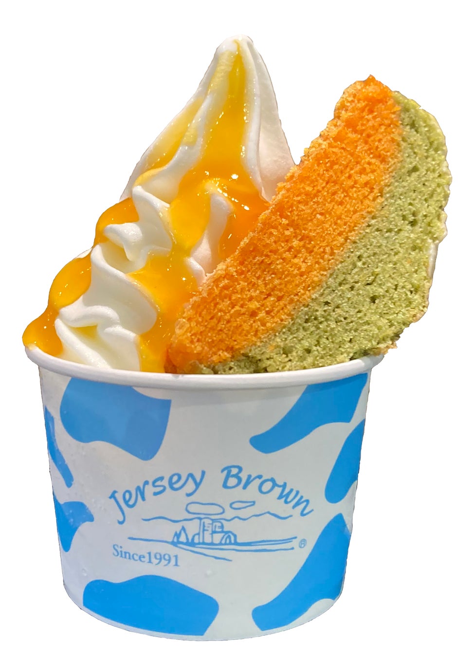 北海道・十勝「髙田牧場」のジャージー生乳を使用した乳製品を展開する「ジャージーブラウン」。ジャージー生乳を使用したカップソフトにオリジナルメロンバームクーヘンをのせた「メロンバーム」。生乳のフレッシュさとコクが自慢のソフトクリームにさわやかなメロンの甘さと香りが楽しめるバームクーヘンを合わせました。