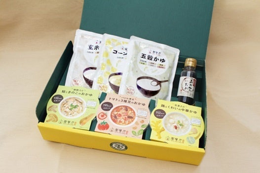 今回新発売となる各種セットは、全て「マタニティフード」として認定された商品をラインアップ。「カップ粥」をはじめ、素材の味を活かした「パウチ粥」、おかゆを引き立てる“とっておきの隠し味”「おかゆのたれ」、さらに無農薬で育てられた茶葉をブレンドした「謝朋殿」オリジナルのノンカフェイン健康茶「寿朋茶」をそろえ、ギフトにも最適なセットとなっています。