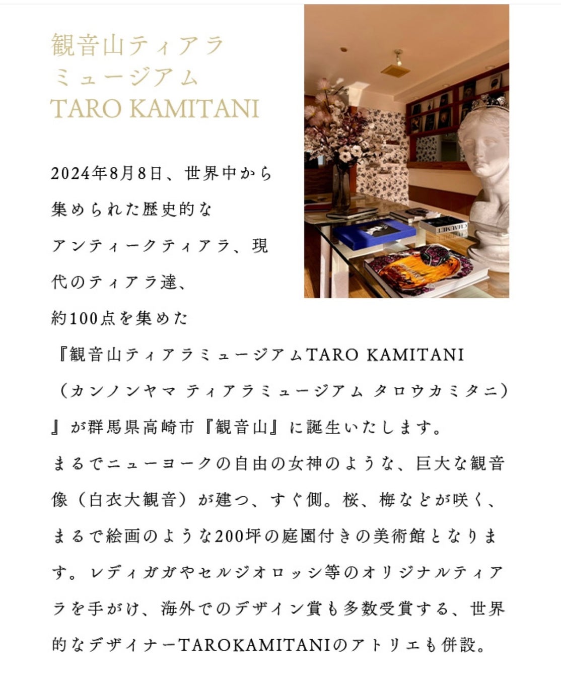 2024年8月8日、群馬県高崎市に、国内初となるティアラ専門の美術館『観音山ティアラミュージアム TARO KAMITANI』がオープン。