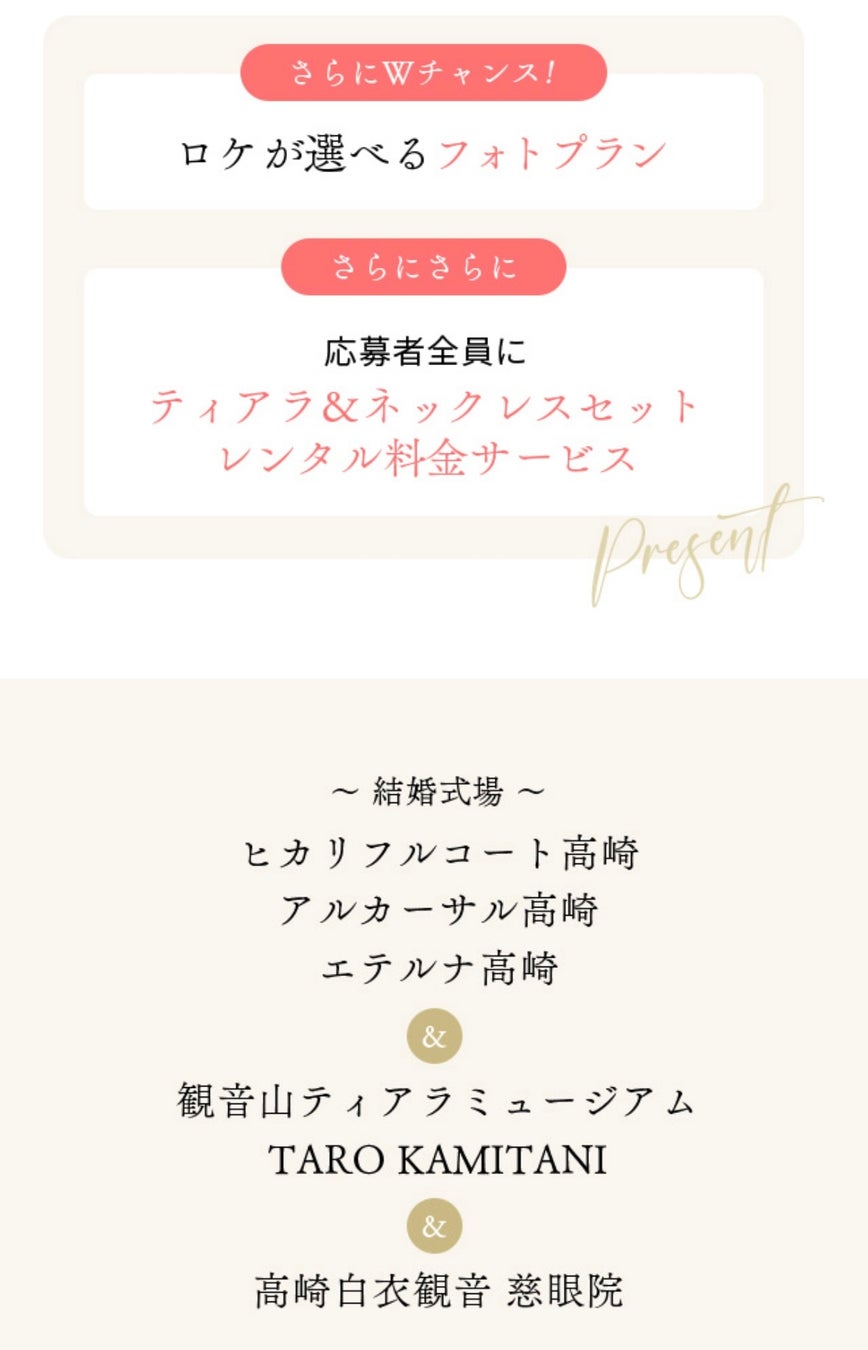 高崎市で結婚式をするカップルを応援したい!という目的のもと、高崎市結婚式応援プロジェクトと称し、高崎市内式場や慈眼院での結婚式、観音山ティアラミュージアムでのウェディングフォト、ティアラのレンタルなどの費用が無料になるプレゼントキャンペーンを実施いたします。