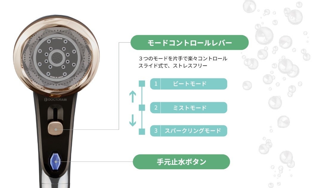また、水流モードも使用用途や部位に合わせて選べる3種を搭載。肌に優しくフェイスケアに適した《ミストモード》、全身にたっぷり潤いを与える《スパークリングモード》の他、マッサージ器を提供し続けてきたドクターエアが提案するリズミカルなタッピング水圧がマッサージのように心地よい《ビートモード》でシャワータイムをエステ時間に。