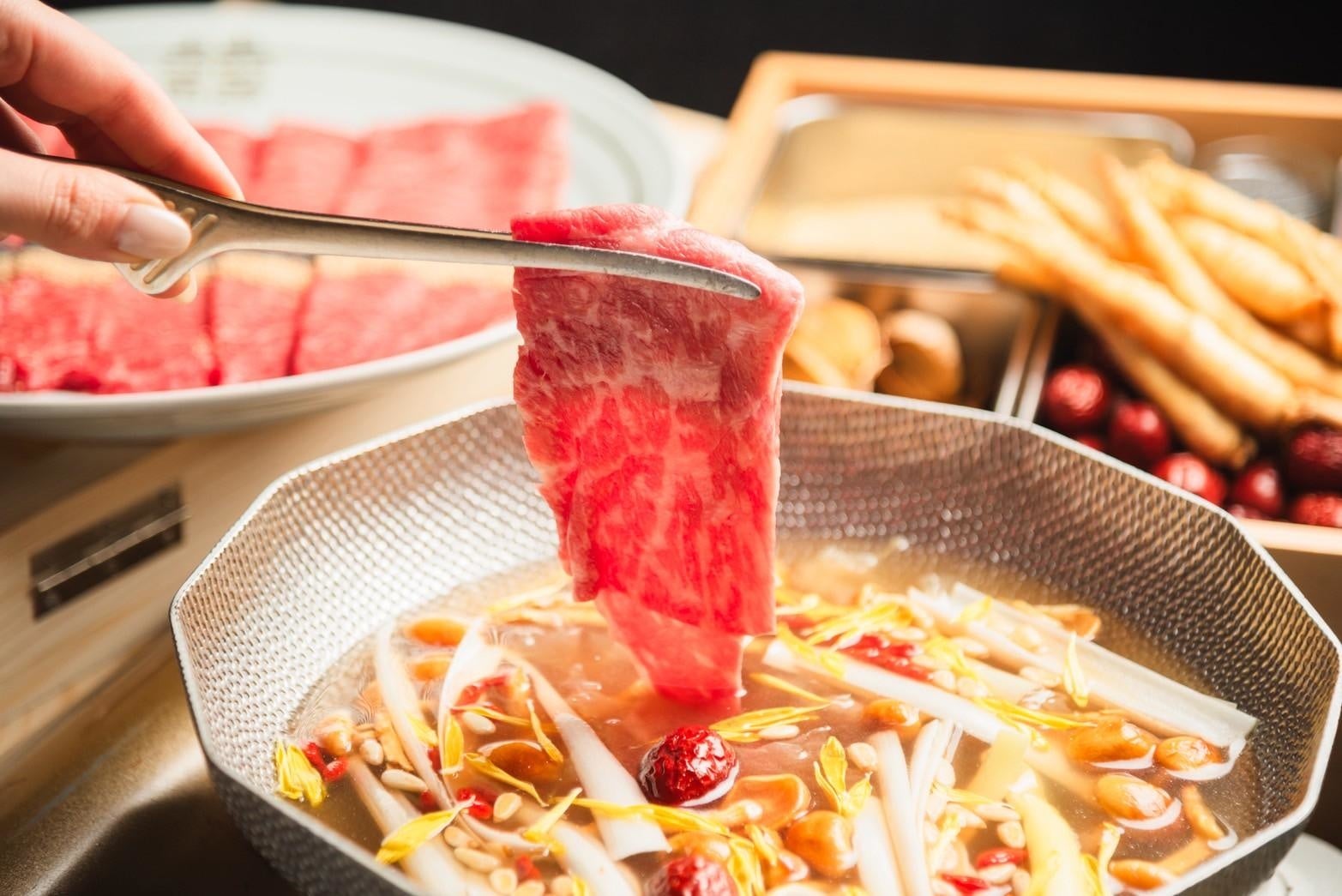 使用する肉はきめ細やかな霜降りと、しっとりとした柔らかさが魅力のA4ランク以上・黒毛和牛(雌牛)のもも肉。肉の旨みをやさしく引き立てるのは、牛テールを3時間以上煮込んだ薬膳が香る特製出汁。白きくらげや山えのき、長ねぎなどの季節の薬膳野菜とともにいただく、身体に優しい、しゃぶしゃぶです。